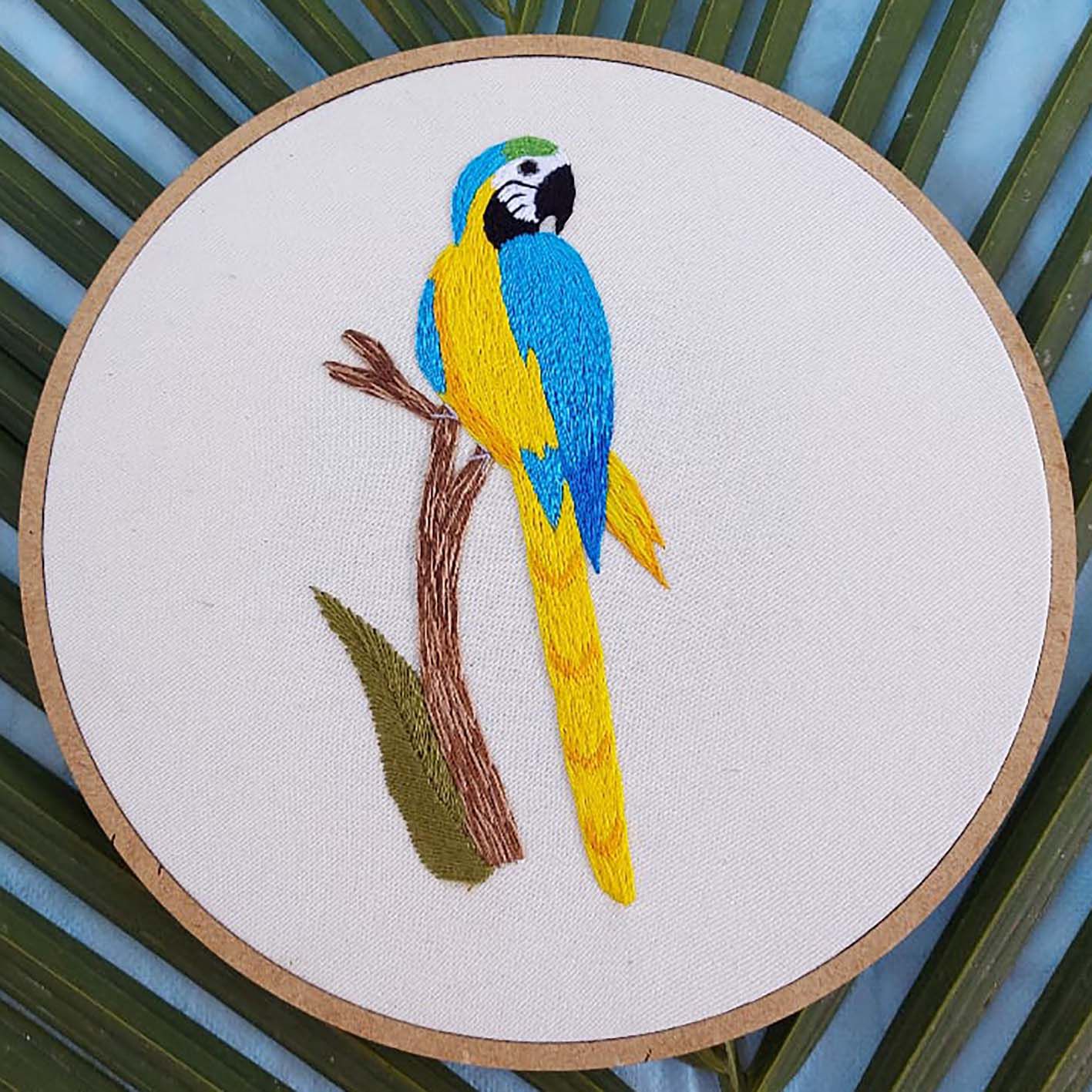 Bordado a mão estilo livre, retratando a arara-canindé. Tecido em algodão cru, linhas 100% algodão, bastidor de madeira.