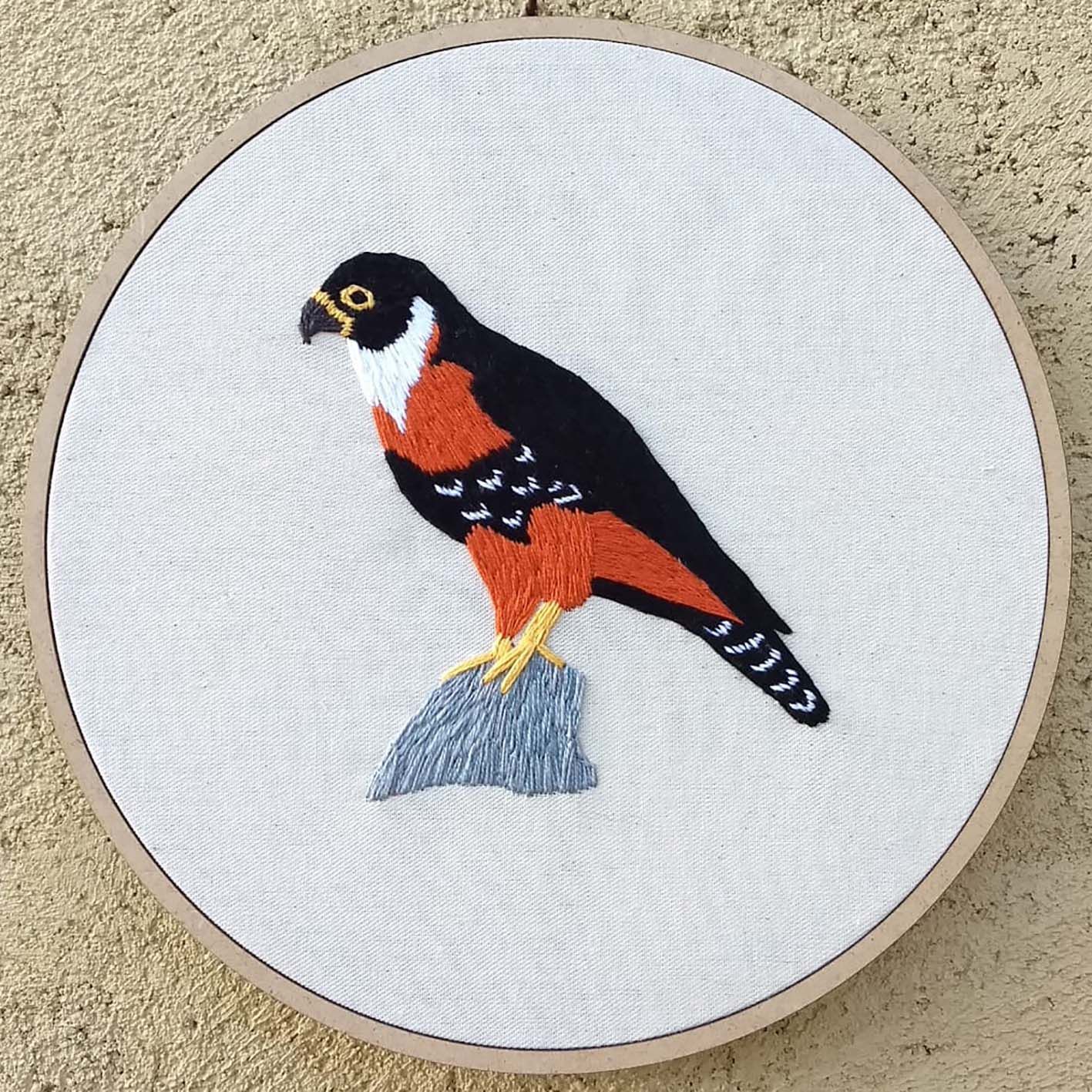 Bordado a mão estilo livre, retratando o falcão-de-peito-laranja. Tecido em algodão cru, linhas 100% algodão, bastidor de madeira.