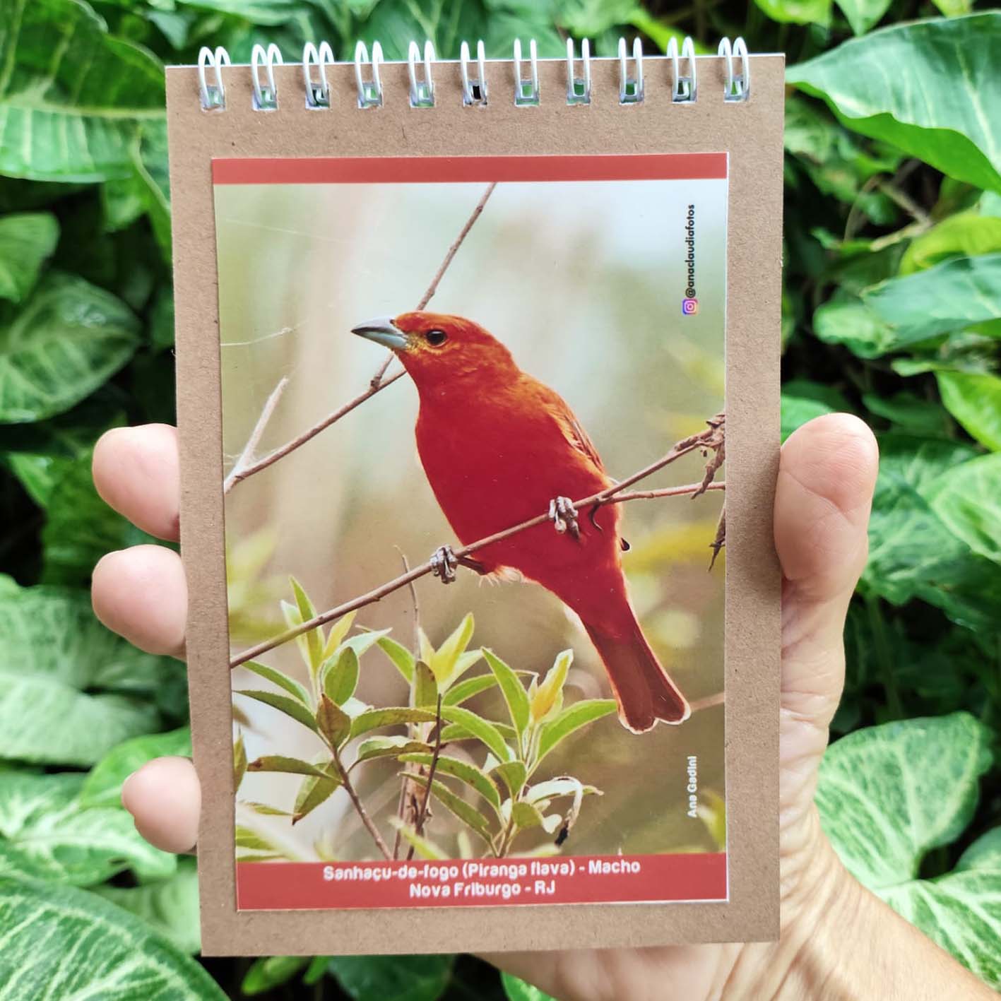 Blocos com capa e contra capa em Kraft, com 50 folhas lisas e com 60g de gramatura. Blocado com wire-o branco / prata 7/8 (tipo duplo espiral). capa ilustrada com foto de sanhaço-de-fogo por Ana Gadini.