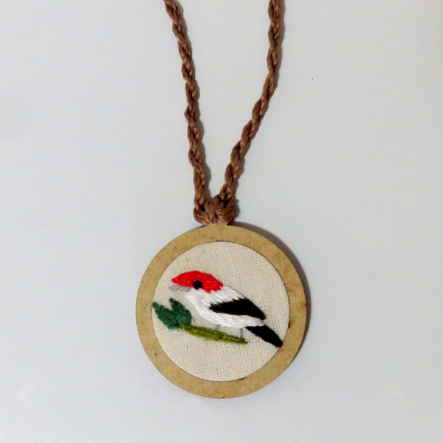 Pingente de MDF bordado a mão com linha Lisa 100% polipropileno. Cordão com trabalho torcido.