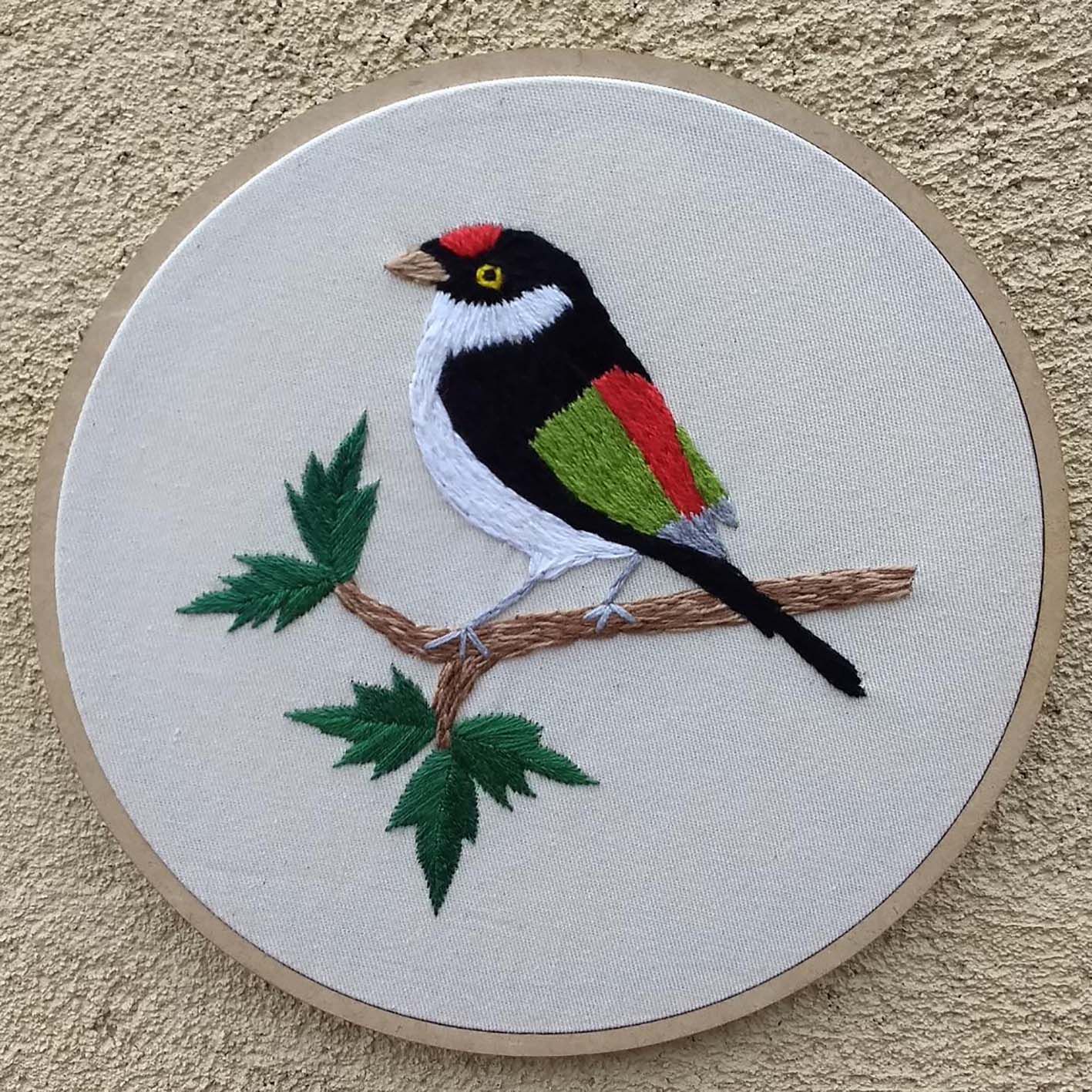 Bordado a mão estilo livre, retratando o tangarazinho. Tecido em algodão cru, linhas 100% algodão, bastidor de madeira.