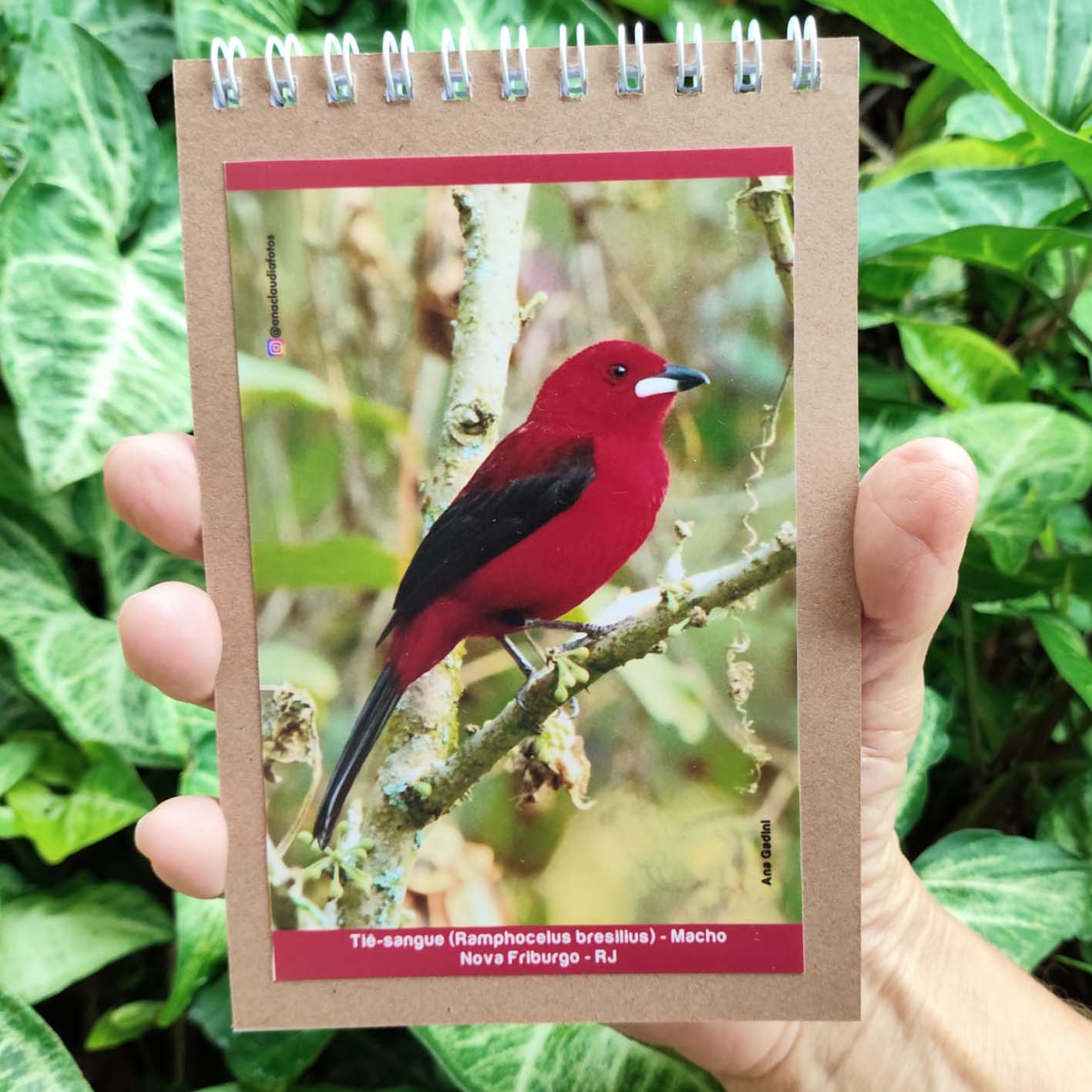 Blocos com capa e contra capa em Kraft, com 50 folhas lisas e com 60g de gramatura. Blocado com wire-o branco / prata 7/8 (tipo duplo espiral). capa ilustrada com foto de tiê-sangue por Ana Gadini.