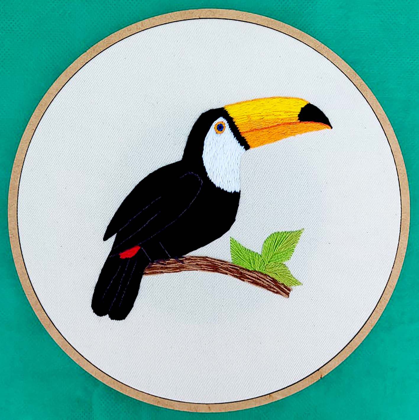 Bordado a mão estilo livre, retratando o tucanuçu. Tecido em algodão cru, linhas 100% algodão, bastidor de madeira.